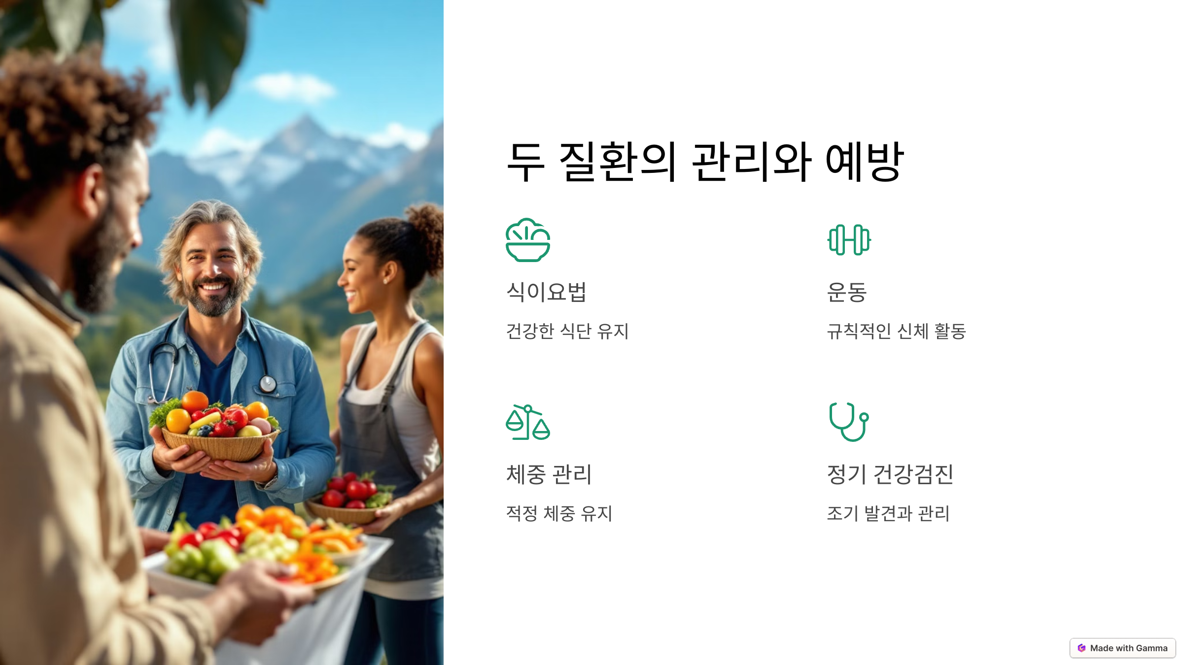 - 체중 감량은 내장 지방을 줄여 두 질환의 위험을 동시에 낮춥니다.