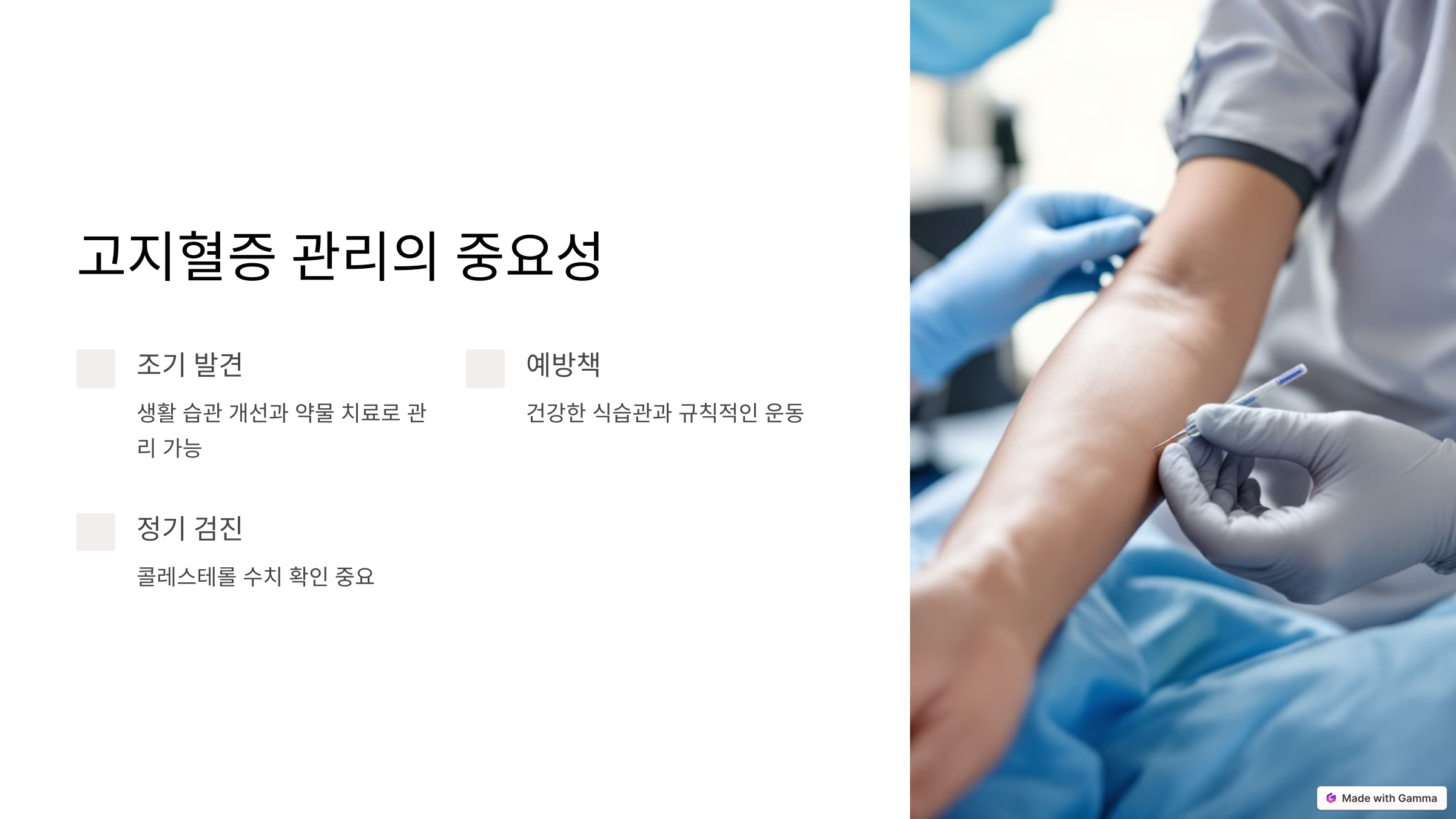 고지혈증은 조기에 발견하면 생활 습관 개선과 약물 치료로 관리할 수 있습니다. 건강한 식습관과 규칙적인 운동은 가장 효과적인 예방책입니다. 특히 정기 검진을 통해 자신의 콜레스테롤 수치를 확인하는 것이 중요합니다.