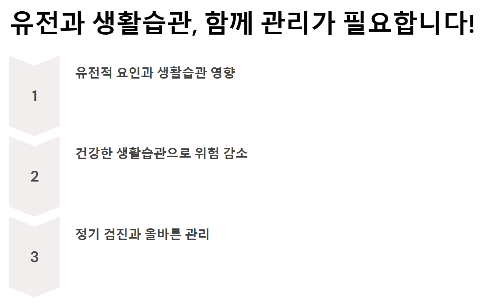 - 유전적 요인이 있어도 건강한 생활습관을 유지하면 발병 위험을 크게 낮출 수 있습니다.