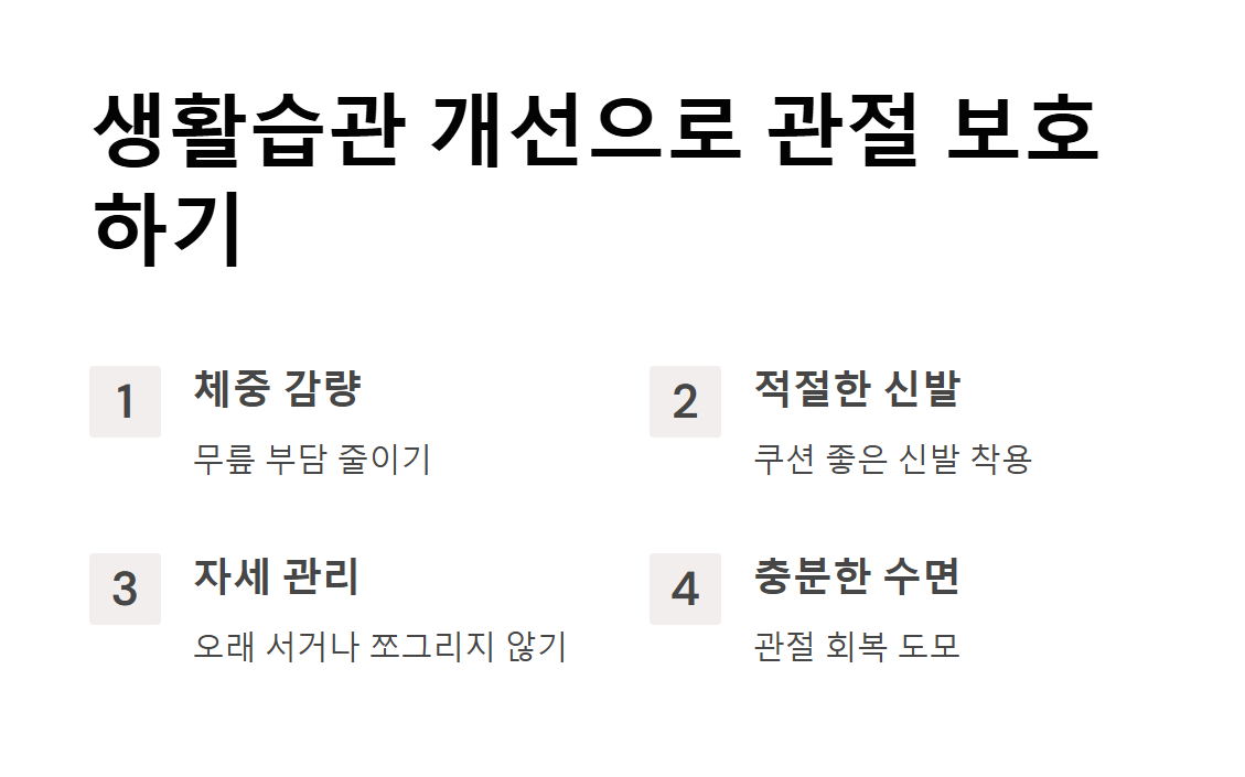 - 규칙적인 스트레칭과 운동으로 관절 가동성 유지