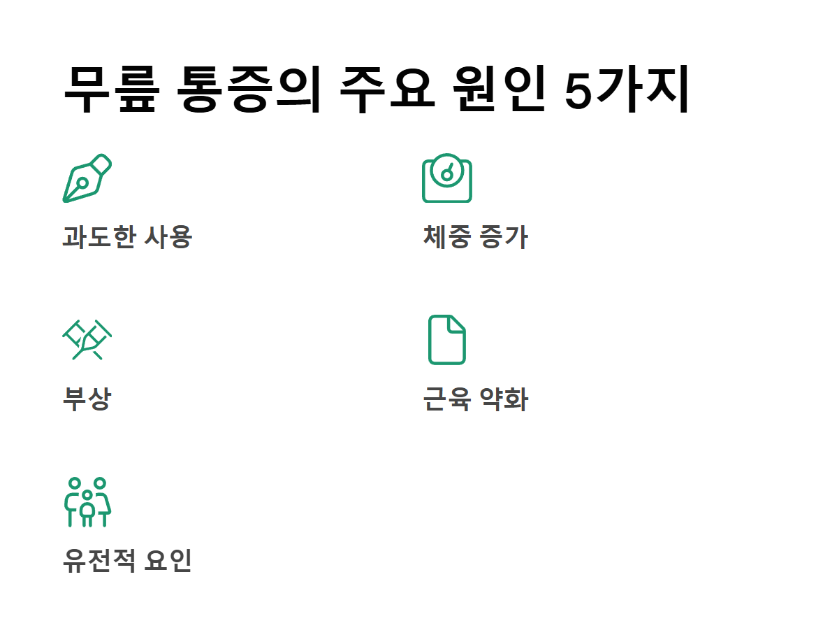 - 체중 증가: 과체중은 무릎 관절에 가해지는 부담을 증가시켜 통증을 유발.