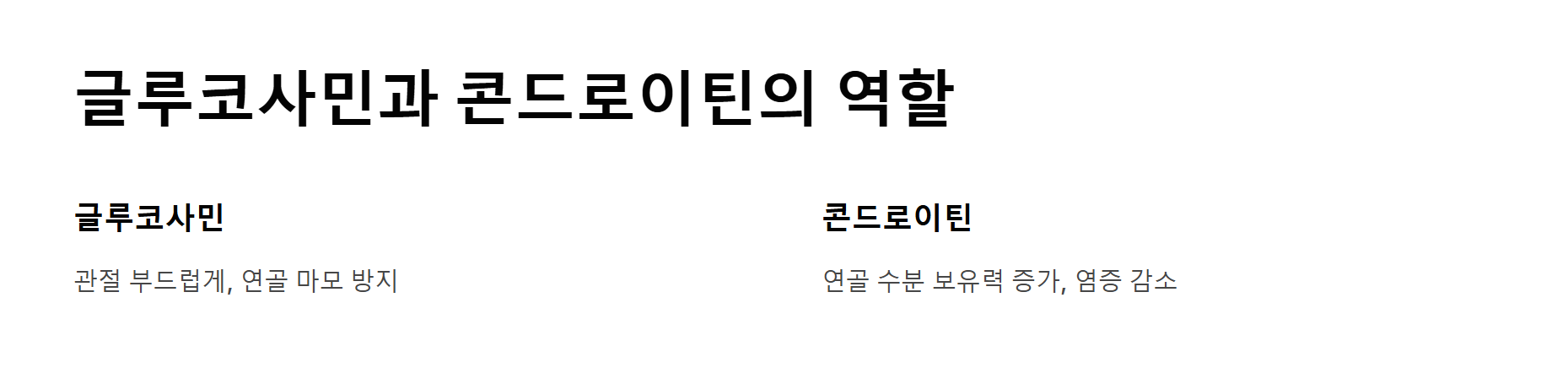 - 콘드로이틴은 연골의 수분 보유력을 높이고 염증을 줄이는 데 효과적입니다.
