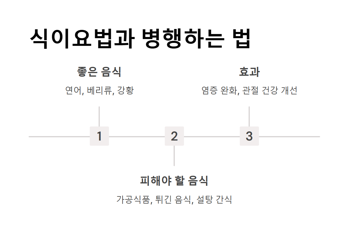 - 정기 검진: 관절염 진행 상태를 주기적으로 점검하세요.
