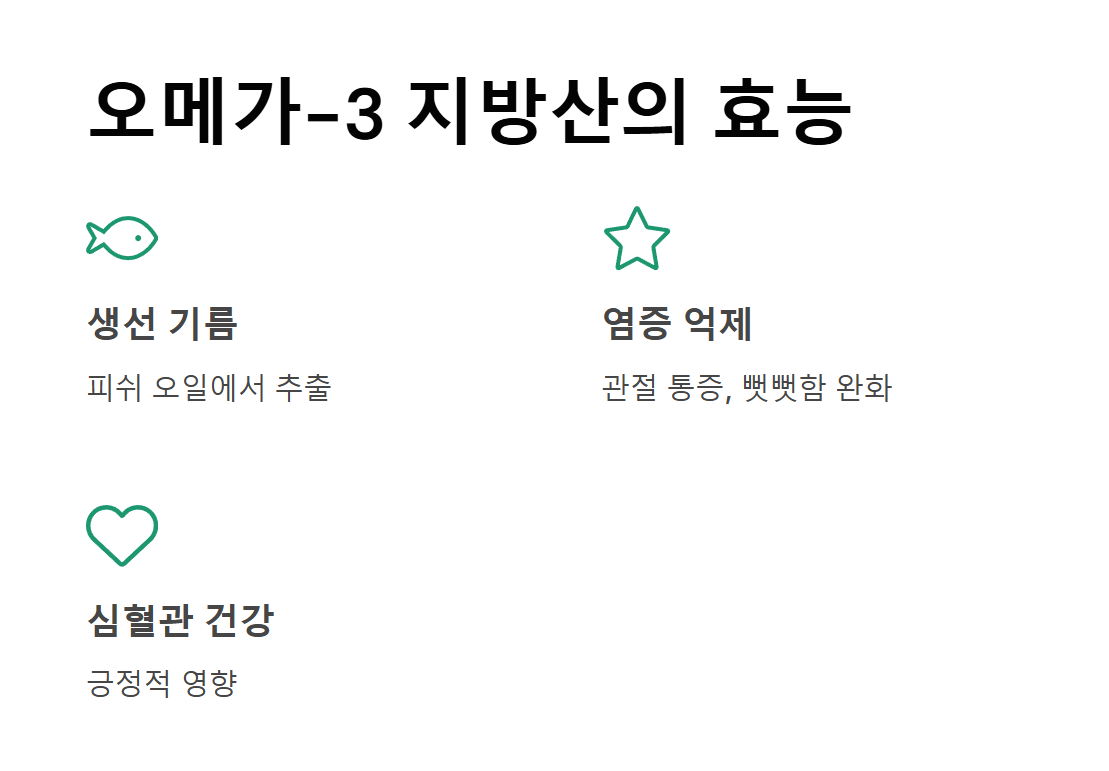 - 생선 기름(피쉬 오일) 또는 아마씨유에서 추출되며, 관절염뿐만 아니라 심혈관 건강에도 긍정적인 영향을 미칩니다.