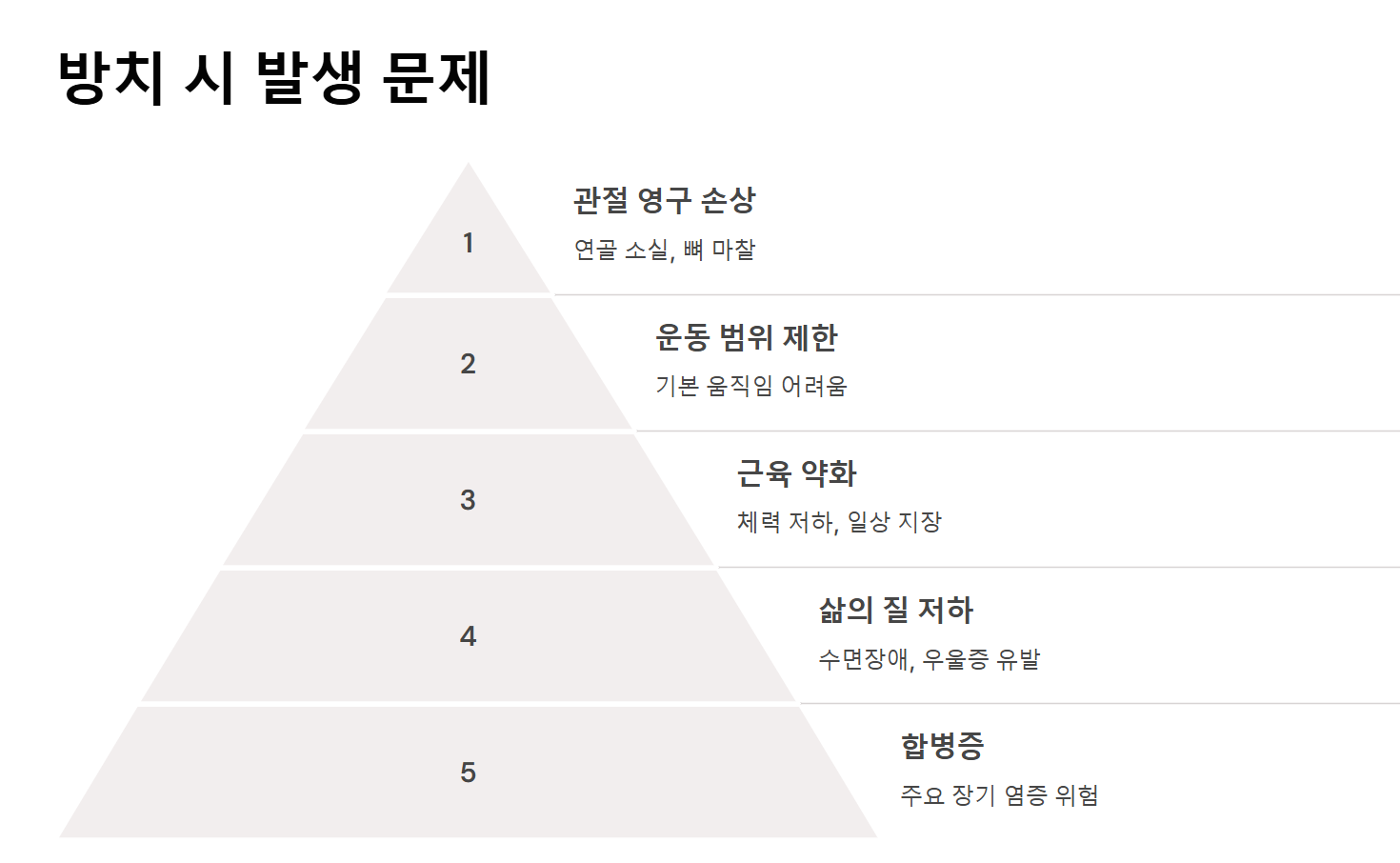 관절염을 방치하면 연골이 계속 닳아 없어지고, 관절 뼈끼리 직접 마찰하게 됩니다. 이는 관절의 변형과 심각한 통증을 유발하며, 심한 경우 인공 관절로 대체해야 하는 상황이 올 수 있습니다.