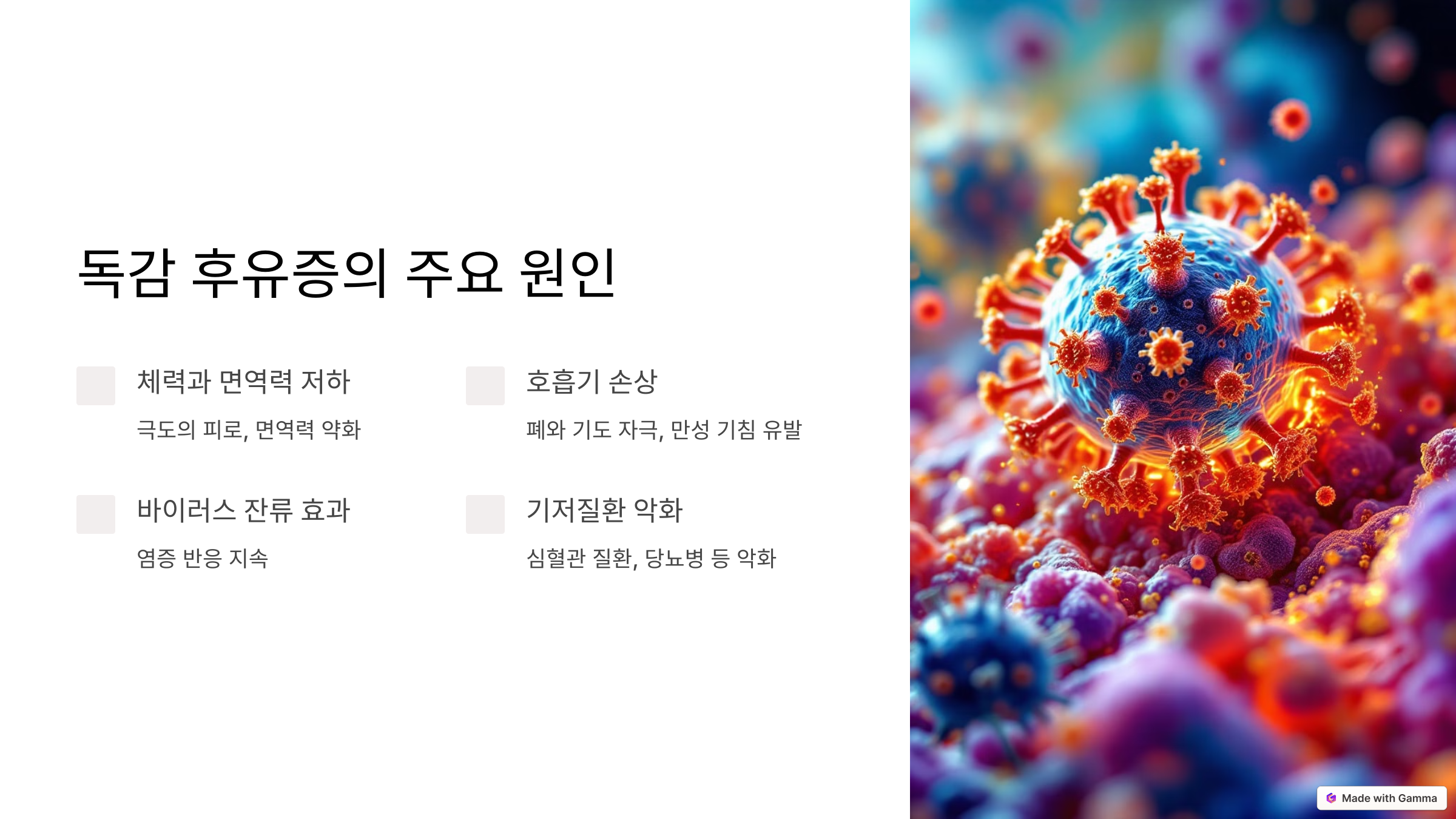 - 독감 바이러스가 사라진 뒤에도 몸에 남은 염증 반응이 후유증을 유발할 수 있습니다.