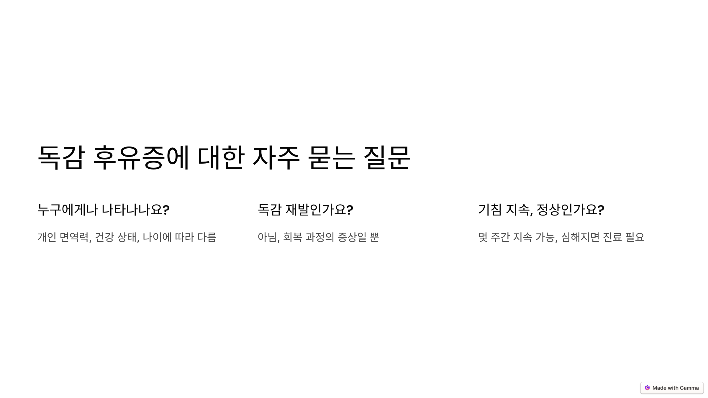 A1. 독감 후유증은 개인의 면역력, 건강 상태, 나이에 따라 달라지며, 고위험군에서 더 흔히 발생합니다.