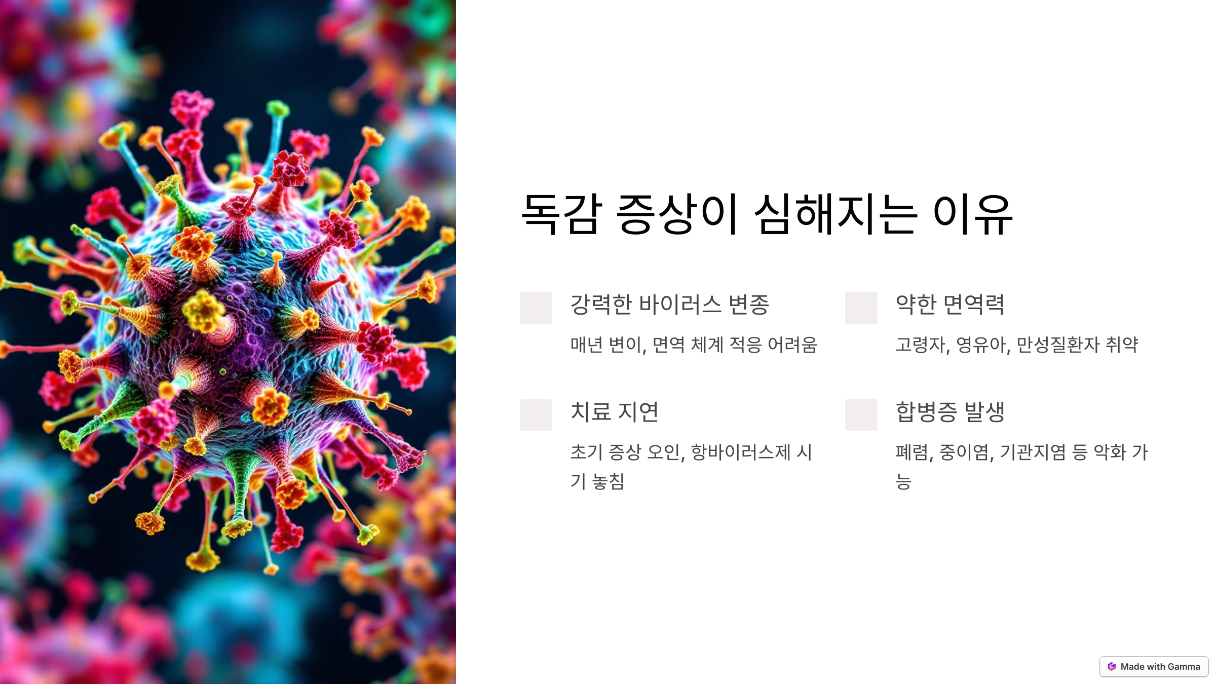 - 매년 독감 바이러스가 변이하면서, 면역 체계가 새로운 바이러스에 적응하기 어려워집니다.