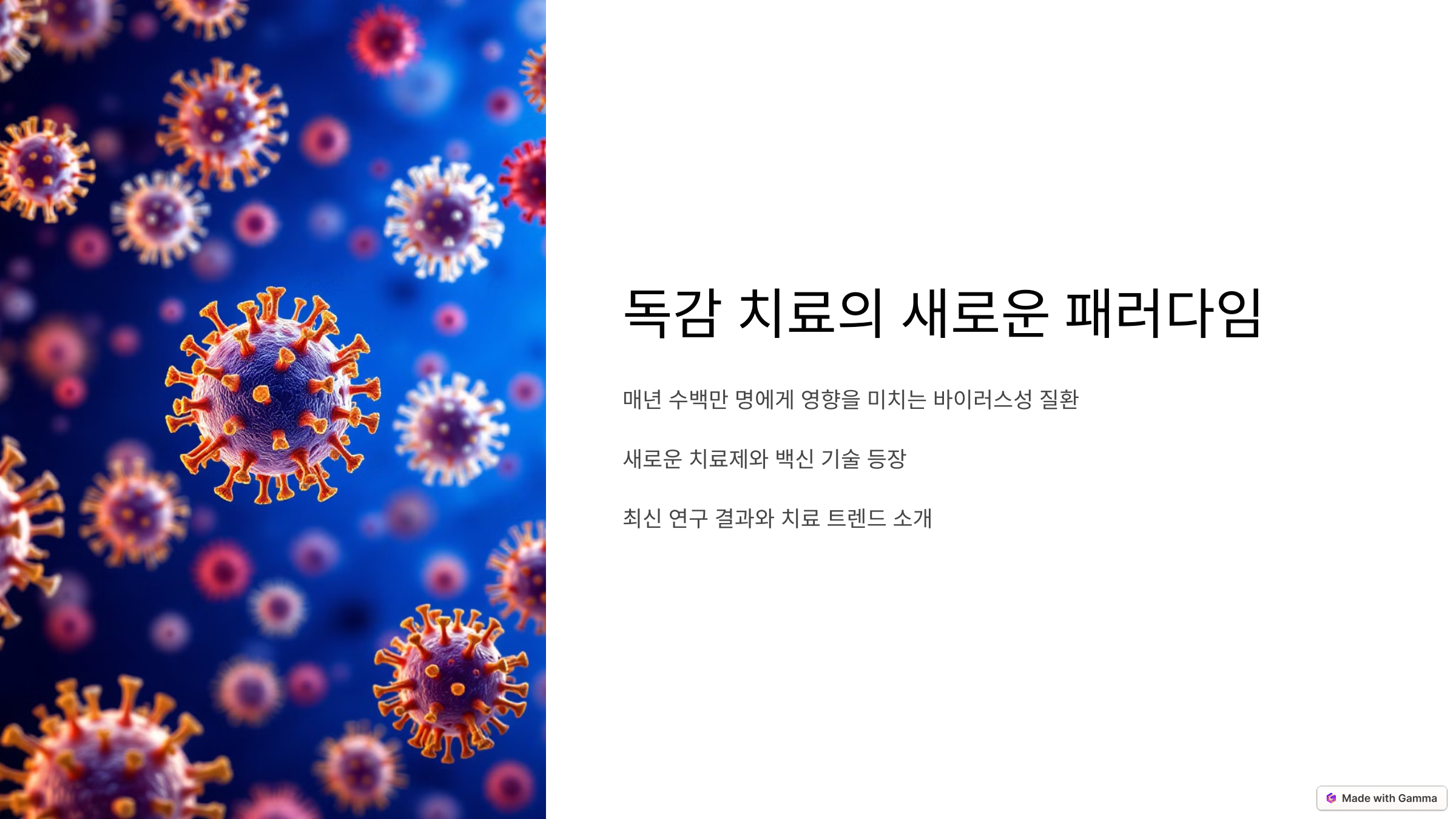 독감은 여전히 전 세계적으로 큰 영향을 미치는 질환이지만, 현대 의학의 발전으로 치료와 예방 방법이 점점 더 진화하고 있습니다. 범용 백신, mRNA 기술, AI 기반 백신 개발 등 새로운 연구와 트렌드가 독감의 위협을 줄이고 있습니다. 앞으로의 발전이 우리의 건강과 안전을 더 효과적으로 지킬 것으로 기대됩니다.