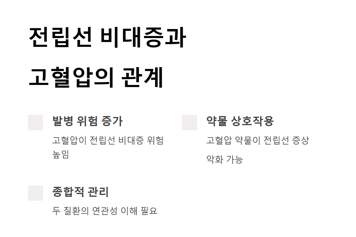 특히 고혈압으로 인해 약물을 복용하는 경우, 일부 고혈압 약물이 전립선 비대증 증상을 악화시킬 수 있어 주의가 필요합니다. 이를 예방하기 위해 두 질환의 연관성을 이해하고 종합적인 관리 방안을 마련해야 합니다.