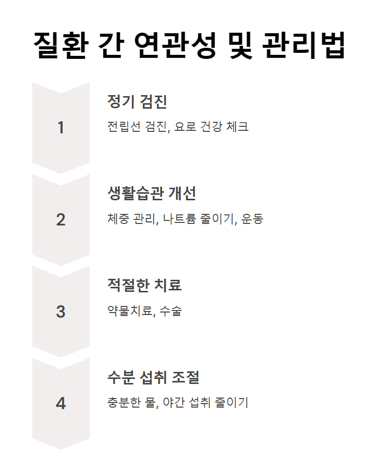 전립선 비대증과 관련 질환들은 서로 영향을 주고받는 경우가 많습니다. 예를 들어, 소변 정체로 요로 감염이 발생하고, 이로 인해 신장에 손상을 줄 가능성이 있습니다. 따라서 종합적인 관리가 중요합니다.